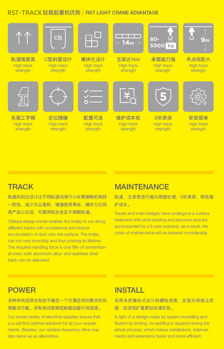 我們廣泛的軌道尺寸選擇能夠滿足從80kg到5000kg的負(fù)載需求。RST-TRACK軌道的斜邊設(shè)計(jì)能夠使得不同的軌道之間的滑行小車保持更好的一致性,并且能夠減少軌道上灰塵堆積的可能性。這也使得滑行小車在軌道上運(yùn)行更加順暢,使得起重機(jī)具有更長的使用壽命。相對于它牌起重機(jī),RST-TRACK輕載型起重機(jī)所需的操作力要小五倍。